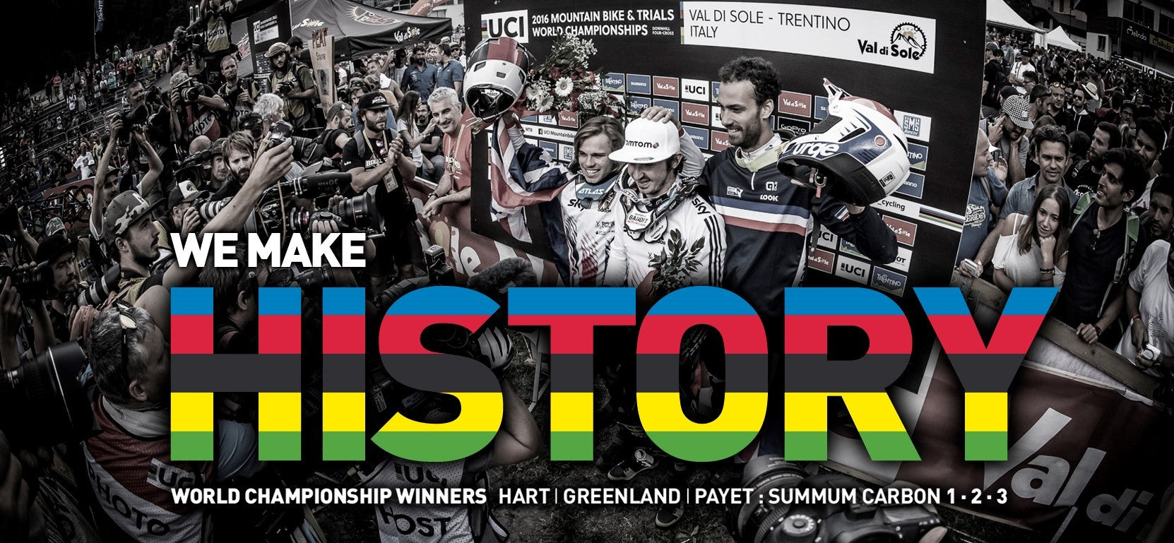 Away from electricity and back in gravity-powered competition, with its superlight Stealth Carbon, Forward Geometry and Zero Suspension System, the 2016 Summum Carbon was the bike of choice for anyone who really wanted to win… with the DH World Championships at Val di Sole delivering an unprecedented World Champs 1-2-3for Mondraker riders: Danny Hart, Laurie Greenland and Florent Payet filling the Elite Men podium in Italy! Hart had the Summum Carbon dialled all season, winning three World Cups at Lenzerheide, Mont-Sainte-Anne and Vallnord, and Mondraker ended the season as the number 1 ranked team.
